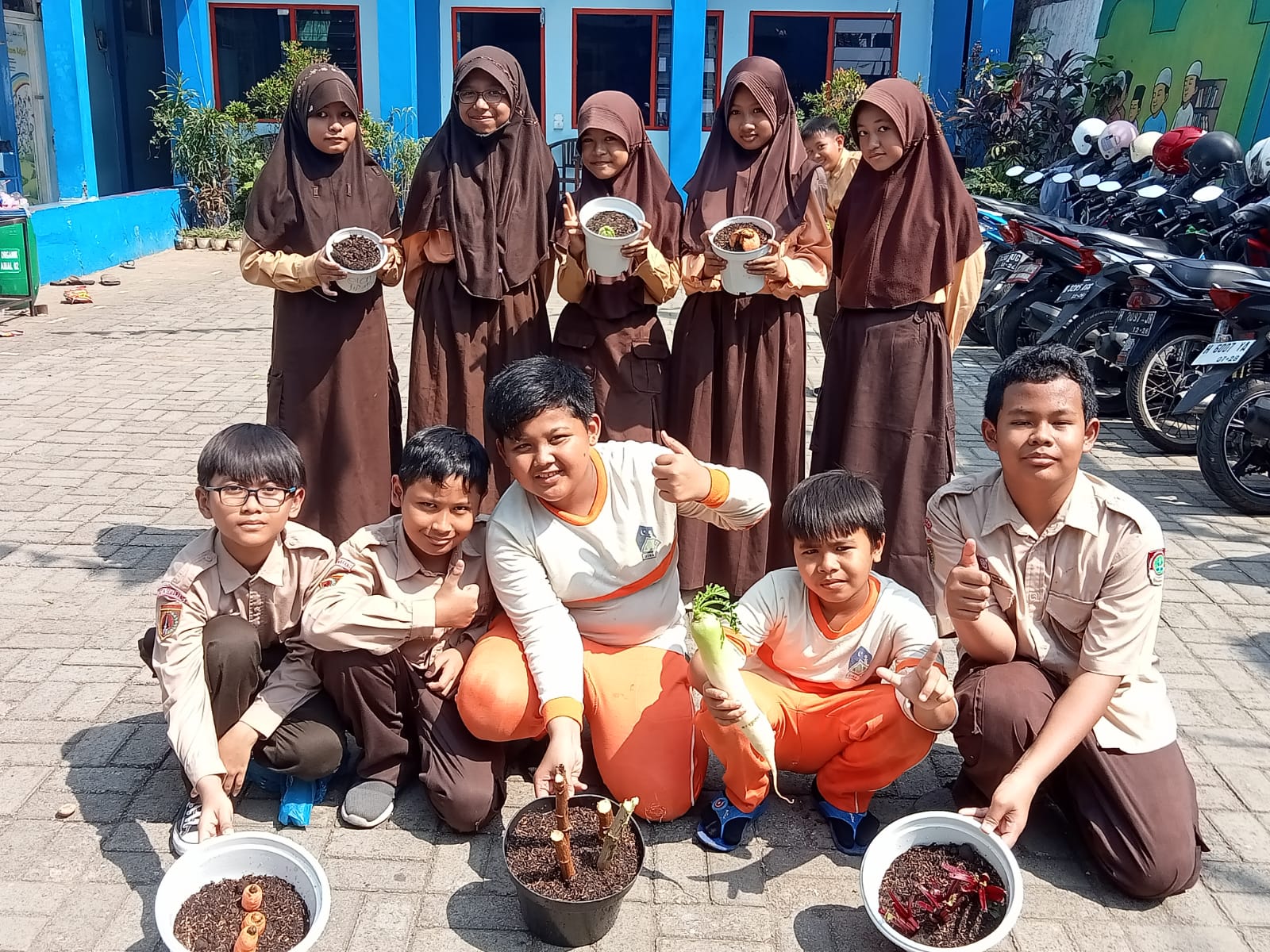 Setiap kelompok sudah menyiapkan dan membawa peralatan yang harus dibawa, yaitu tanaman (yang sudah ditentukan sesuai kelompoknya), 2 pot yang ukurannya sudah disesuaikan dengan tanaman yang dibawa, serta cetok/sekop kecil. Media tanam (tanah subur) sudah disediakan sekolah. Bu Ana, Bu Esqi, Bu Retno dan Pak Dzikron, sebagai walikelas 6 mendampingi kegiatan puncak tema kali ini. Tugas menanam mereka tidaklah selesai, masih ada tugas selanjutnya yaitu merawat/menyiram dan mengamati benih dan tanaman yang sudah mereka tanam sampai tumbuh akar, kuncup, batang, daun dan bunga.