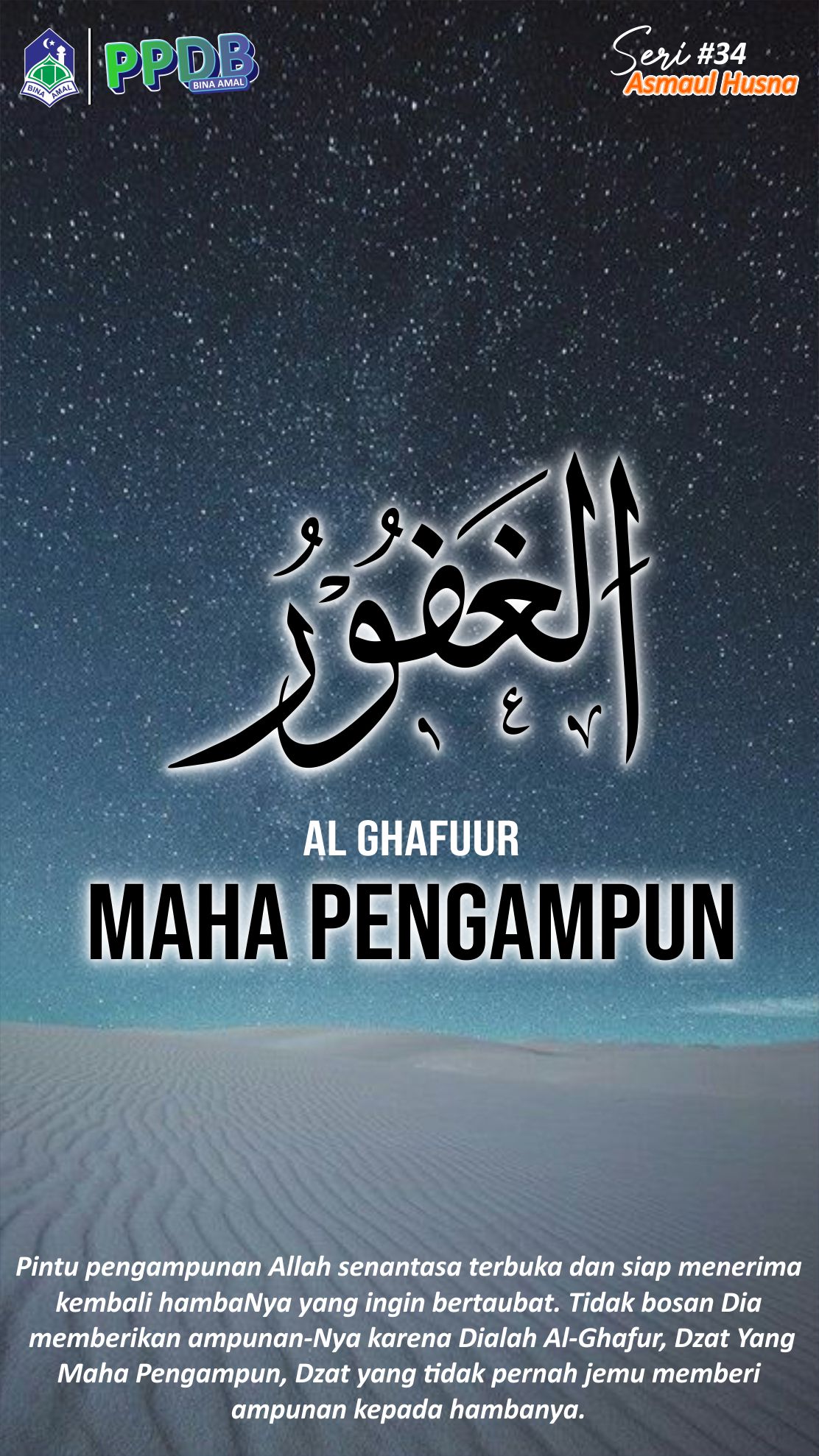 Pintu pengampunan Allah senantasa terbuka dan siap menerima kembali hambaNya yang ingin bertaubat. Tidak bosan Dia memberikan ampunan-Nya karena Dialah Al-Ghafur, Dzat Yang Maha Pengampun, Dzat yang tidak pernah jemu memberi ampunan kepada hambanya.
