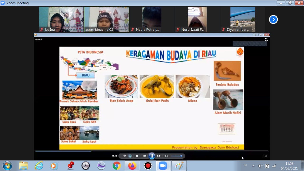Kita patut bersyukur kepada Allah atas anugerah kekayaan alam Indonesia yang sangat indah beserta beraneka ragam suku dan budaya bangsa. Seperti kali ini, siswa kelas IV SDIT Bina Amal 02 ini juga tidak mau ketinggalan ikut berperan mensyukuri dan belajar bersama menggali keragaman suku bangsa dengan mengikuti puncak tema ke 7 dengan judul Indahnya Keragaman di Negeriku. Kamis, 4 Februari 2021 pada pukul 10.00 – 11.50 WIB . Puntem kali ini diikuti oleh 40 siswa dan 2 guru SDIT Bina Amal 02. Meskipun melalui media zoom dari rumah, tidak menyurutkan semangat siswa untuk mengikuti Puncak tema kali ini.